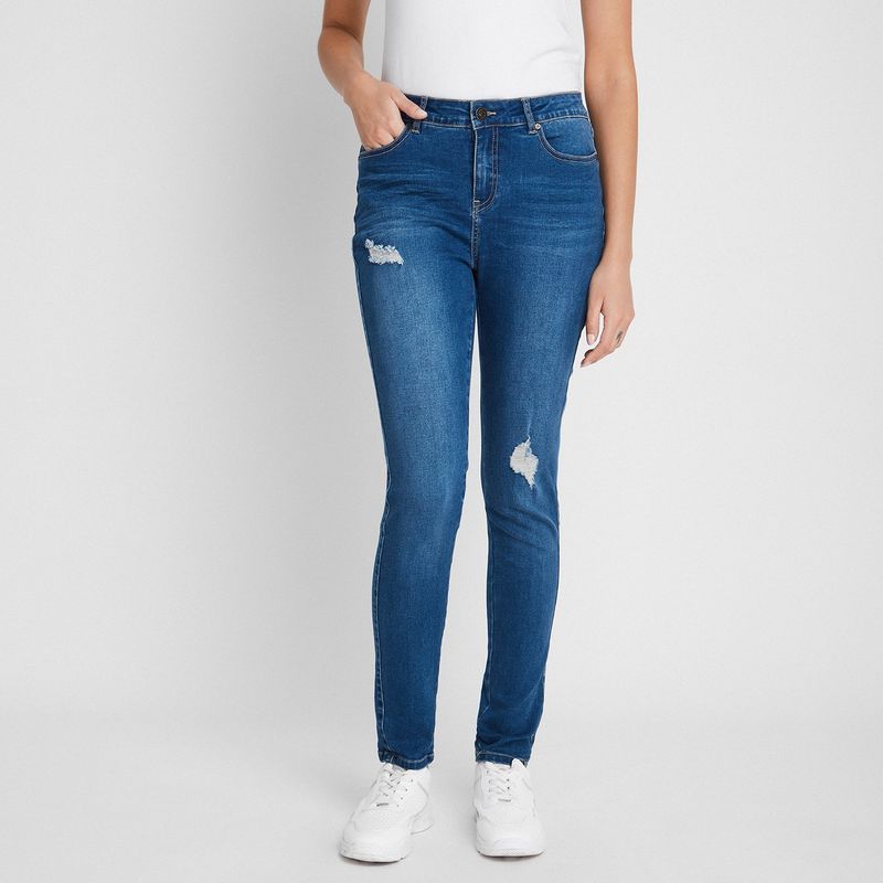 | Descripción del Producto | Jeans pitillo de 5 bolsillos con roturas, marca Curvi, modelo 73001147, color azul claro. Composición: 75% Algodón, 23% Poliéster, 2% Spandex. Fit: Skinny. Tiro alto. |